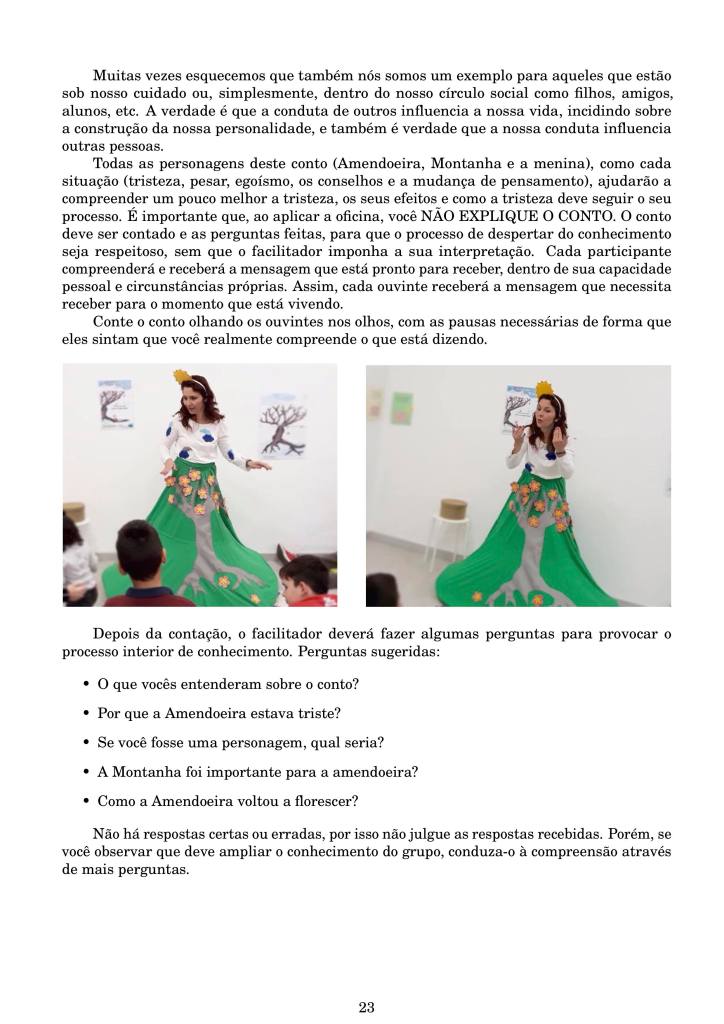 Deve-se notar também que é importante conceber a conto num contexto pedagógico, a fim de construir um aspecto pessoal e social. Também é importante que o conto capture o interesse do participante, para que o facilitador tenha que antecipar o que pode acontecer e imaginar todo o contexto da atividade.