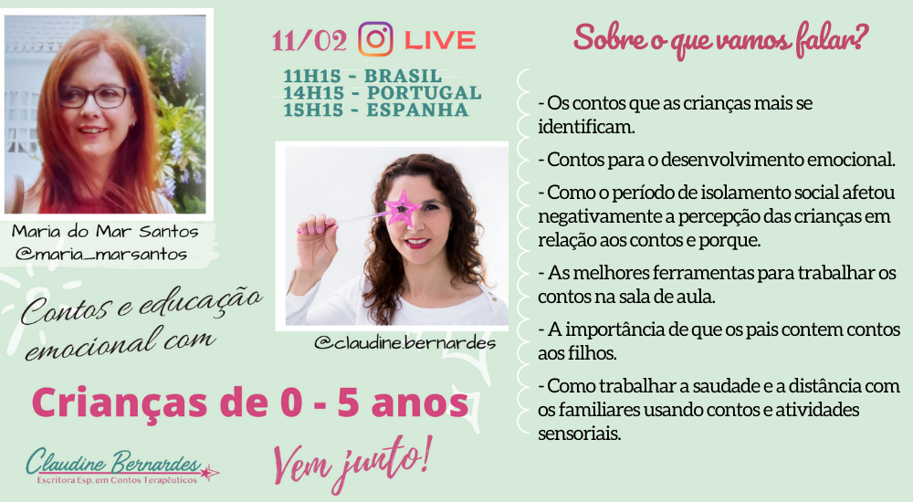 Nesta quinta-feira dia 11 tenho uma live muito interessante! Estará comigo a professora portuguesa Maria do Mar Santos, que é educadora há 28 anos, com formação em dança terapia. Maria do Mar já trabalhou com crianças e adolescentes, porém atualmente atua como professora de educação infantil.