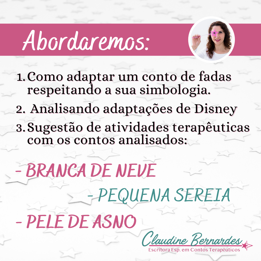 Nessa Aula Online de 2 horas, abordarei estes temas, utilizando como base TRÊS CONTOS INCRÍVEIS: Branca de Neve, Pequena Sereia e Pele de Asno (é possível que você não conheça este porém recomendo conhecê-lo).