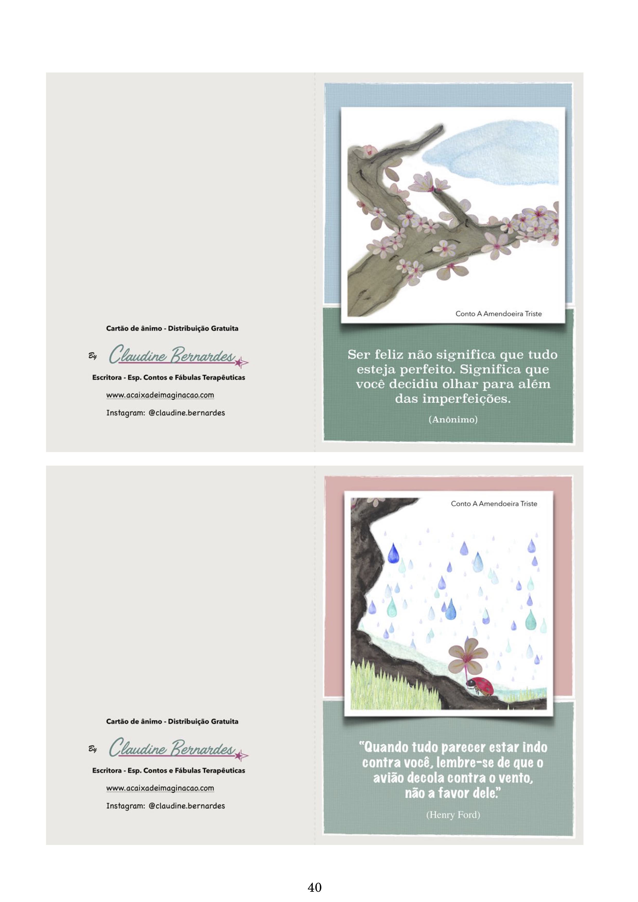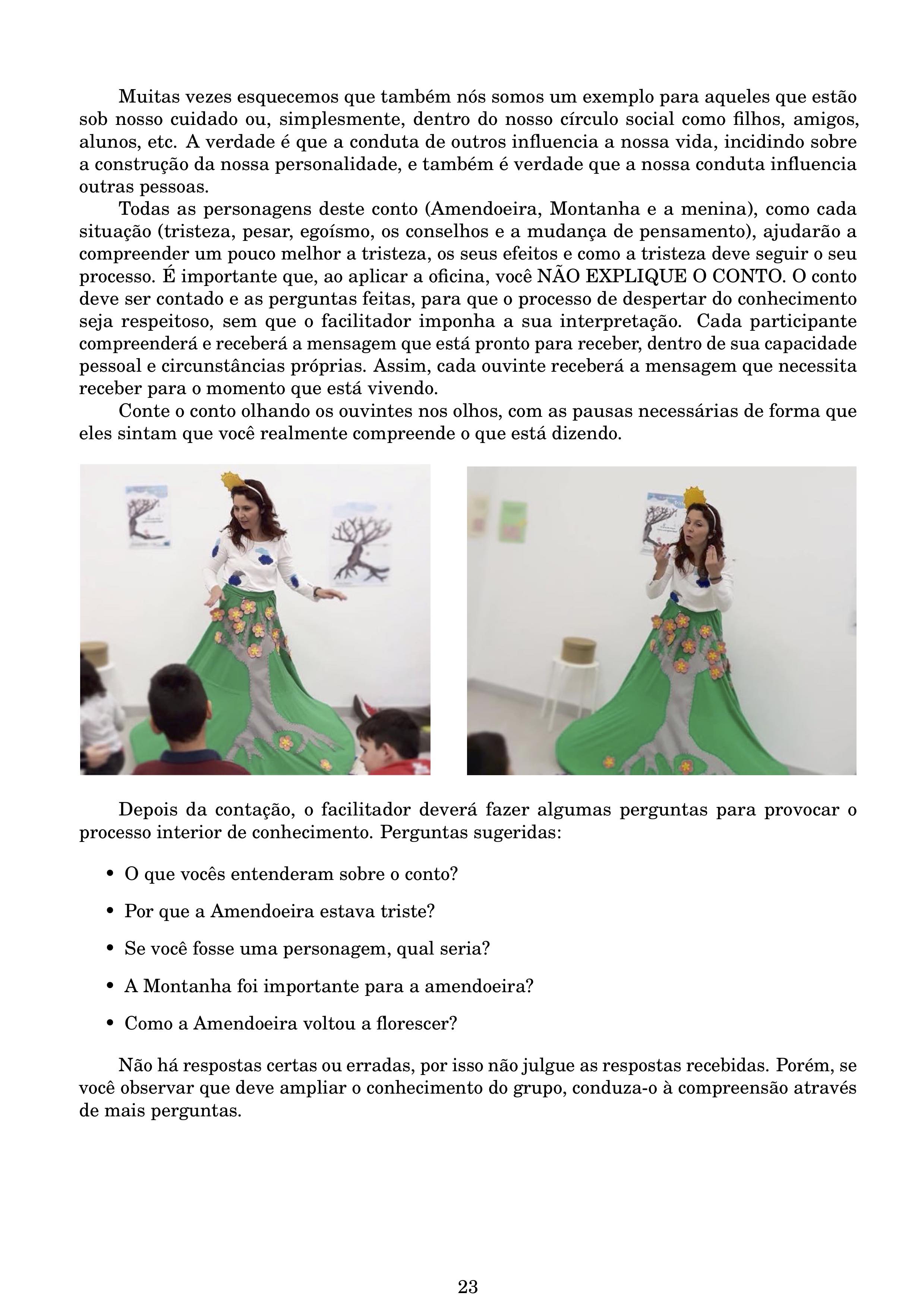 2. OFICINA DE EDUCAÇÃO EMOCIONAL “A Amendoeira Triste”:Se trata de uma Oficina Contoexpressiva criada com base no conto, para desenvolver a compreensão da tristeza e da resiliência, e uma visão mais otimista da vida. MATERIAL GRATUITO de DISTRIBUIÇÃO LIVRE a todos que me pedirem. Basta enviar-me um e-mail a claudinebernardes@acaixadeimaginacao.com ou preencher o formulário abaixo que lhe enviarei. Este material é uma forma de conhecer o meu trabalho, o potencial do livro e da contoexpressão. Não duvide em pedir-me, lhe enviarei com muito alegria.