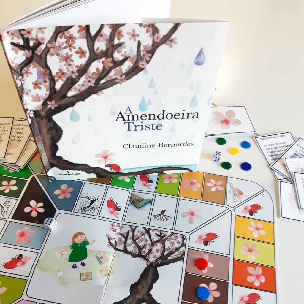 O livro “A Amendoeira triste” vem com um jogo de tabuleiro. Este jogo utiliza 30 cartas que contêm frases que fomentam o otimismo e a resiliência. Como um jogo pode fazer isso? Como vocês sabem sou Especialista em Contos e Fábulas Terapêuticas, meu trabalho está baseado no uso dos símbolos. Para poder guardar tanta informação na memória, o fazemos através dos símbolos que sintetizam informações mais complexas e as guardam no nosso inconsciente. Essas informações as vezes surgem em momentos de necessidade, para ajudar-nos ou até mesmo para prejudicar-nos.